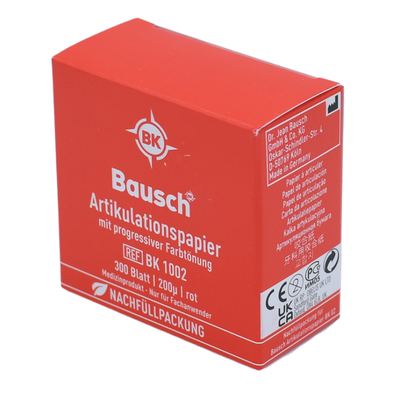 Le papier à articuler de Bausch, sont avec une coloration progressive de 200µm, indique les différentes forces masticatoire au moyen d'une nuance de couleur en fonction de la pression très facile à utiliser.